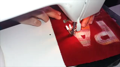 Una vez cosida el asa, ponemos encima la otra parte de la bolsita y cosemos toda alrededor dejando la parte superior sin coser.