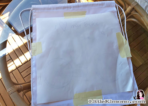 2. Colocamos el papel encarando el dibujo con la bolsa. Hay que tener mucho cuidado de que no se mueva el dibujo cuando pasemos la plancha así que opté por poner unos trozos de cinta de carrocero para sujetar la hoja.