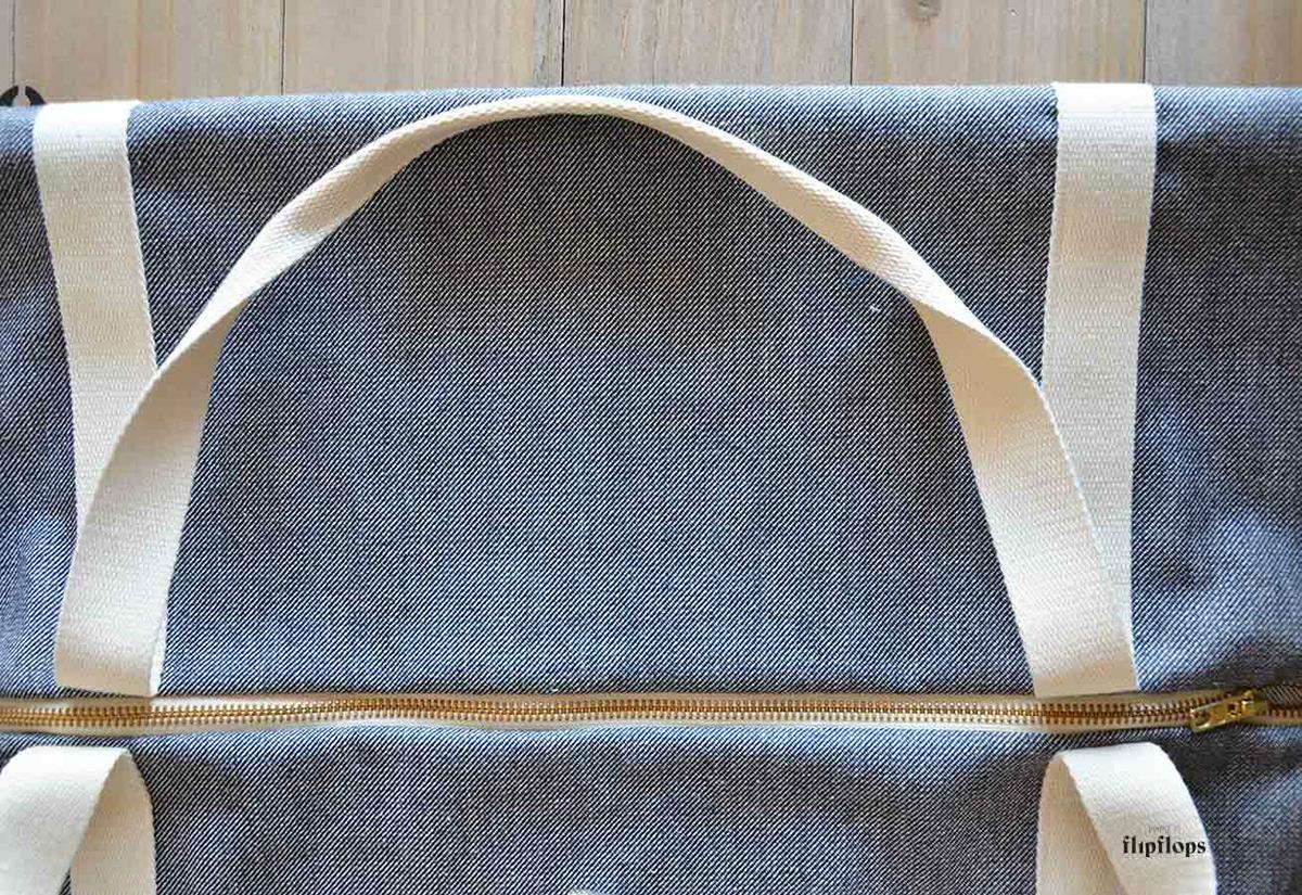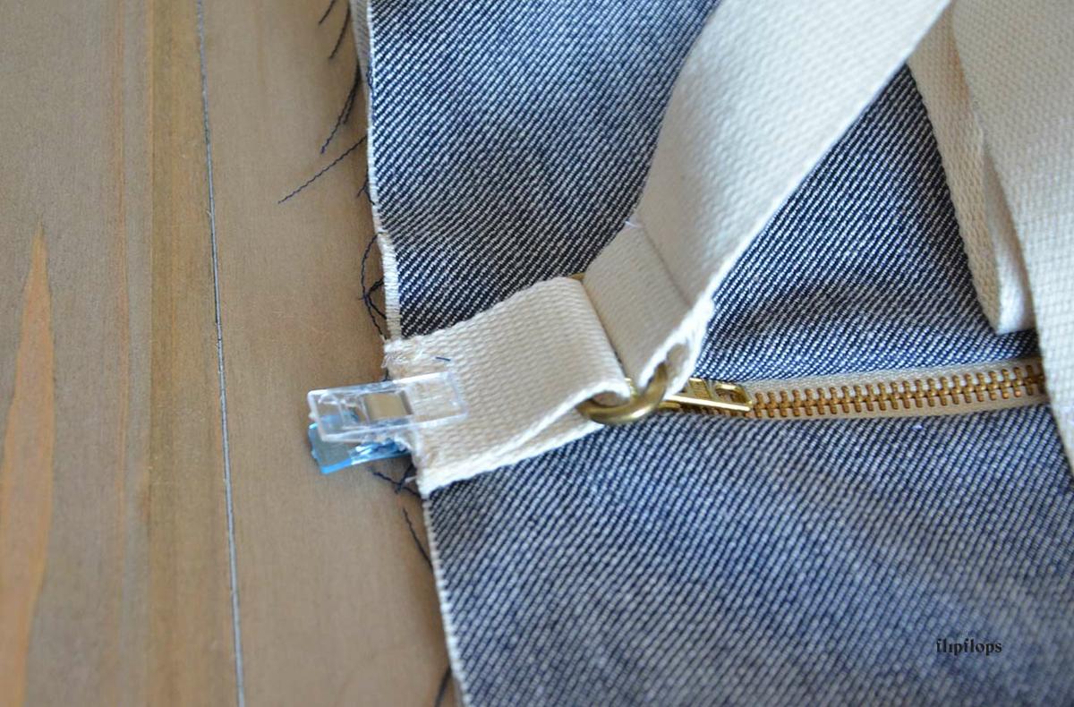 Al coser las asas a la bolsa deja un par de centimetros en los extremos sin coser para poder coser tranquilamente la cremallera.