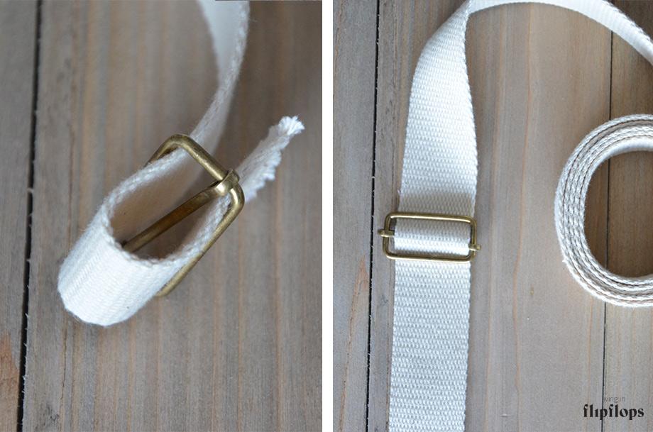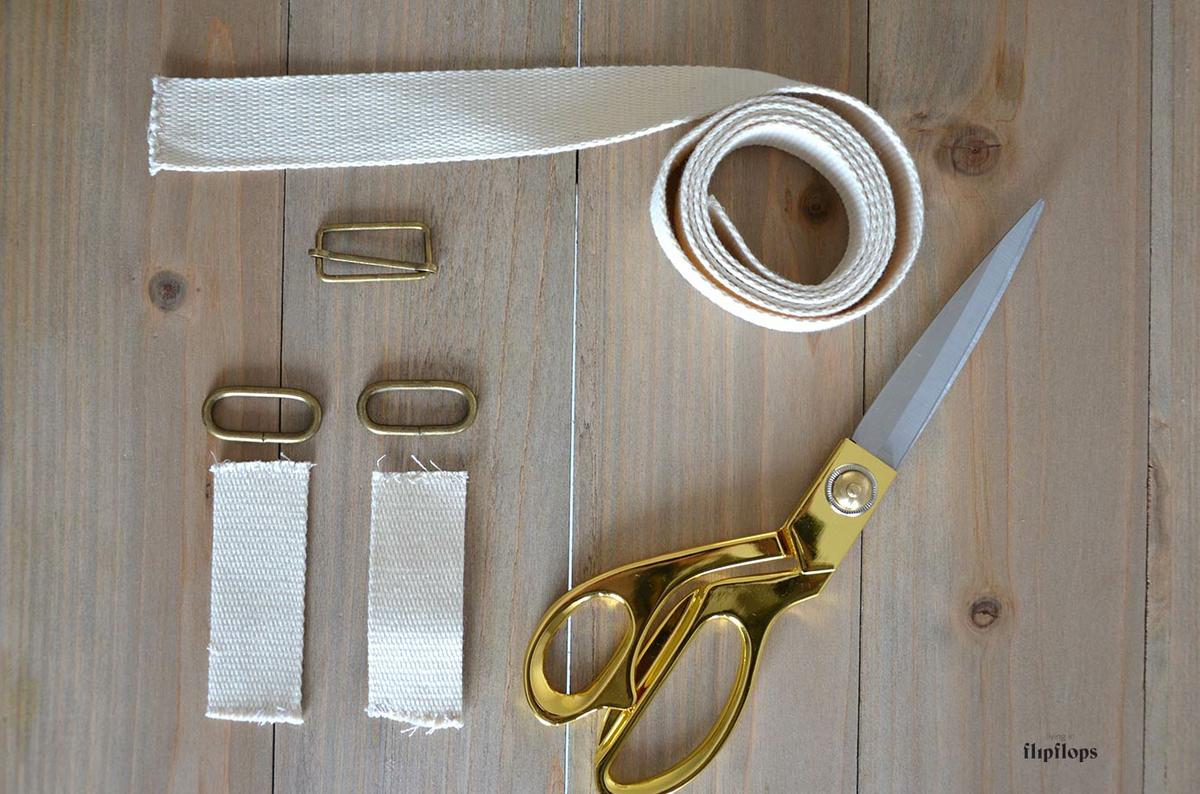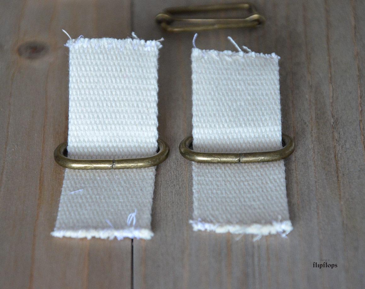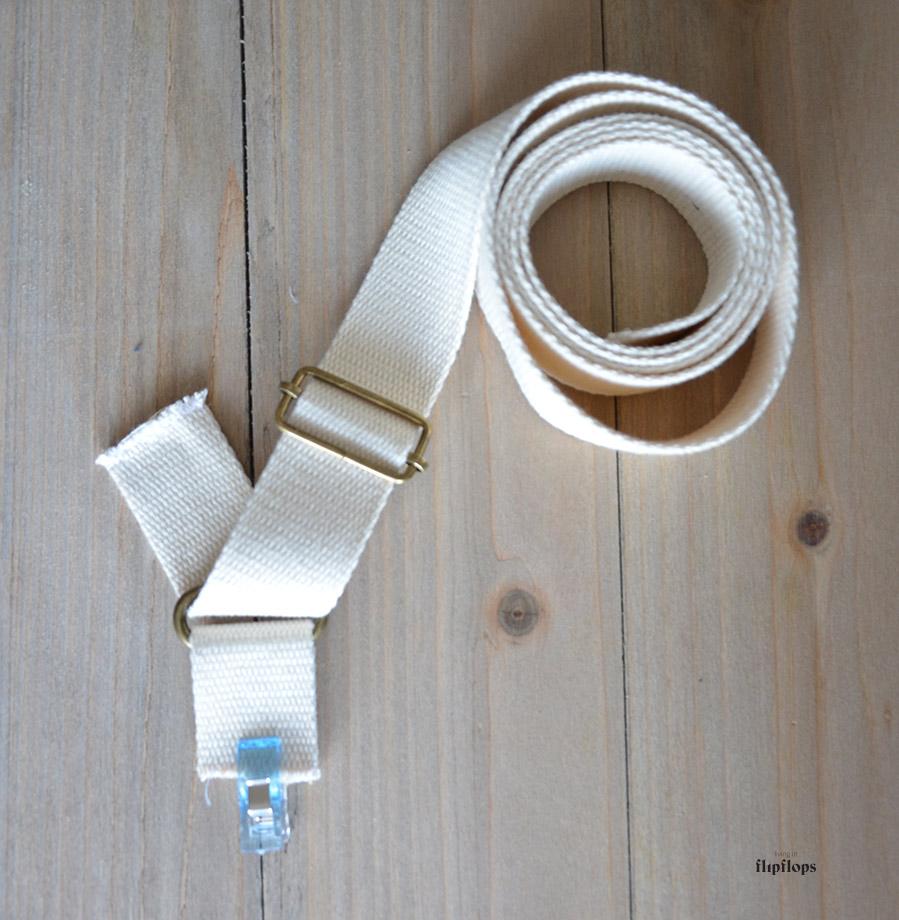 Coge la cinta de 1m30 y pásala por una de las arandelas, como ves en la foto.