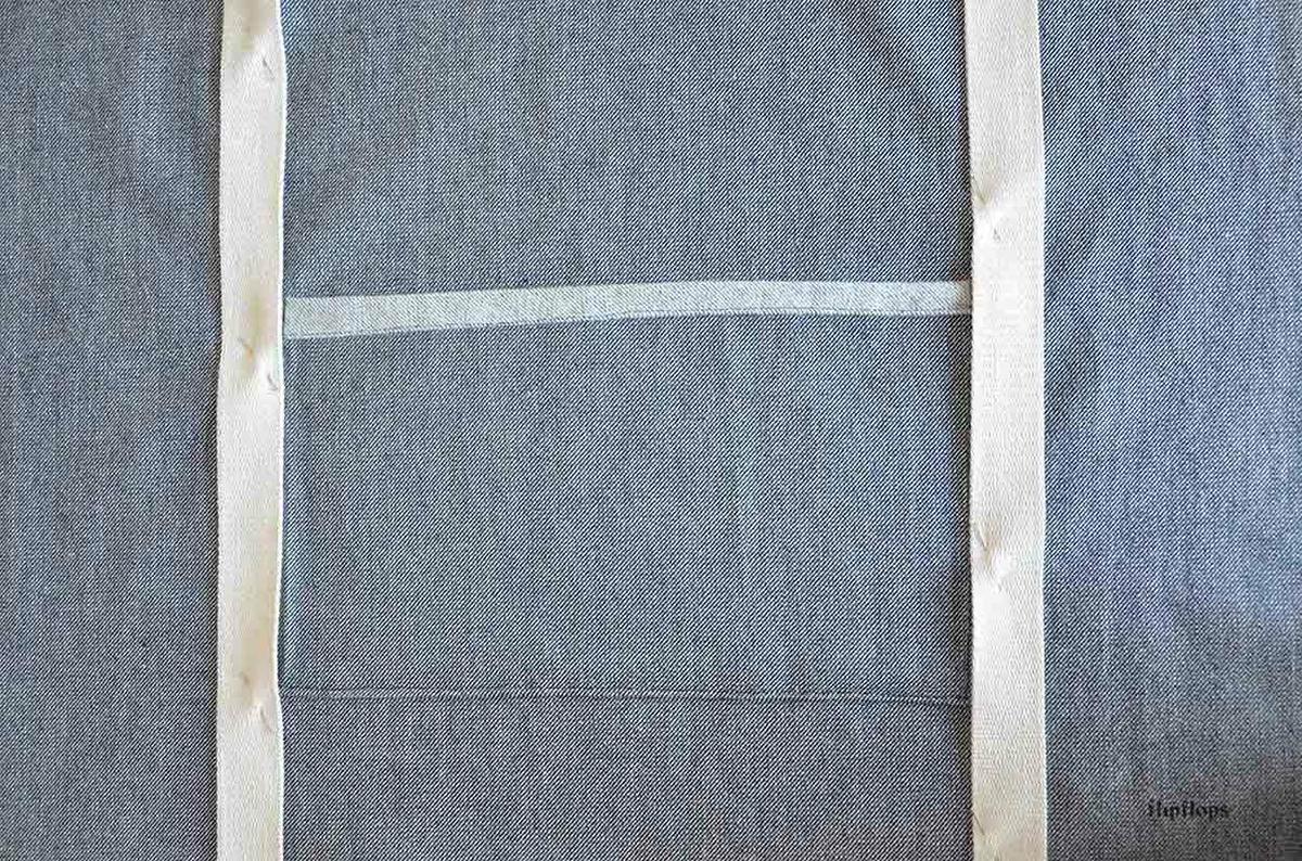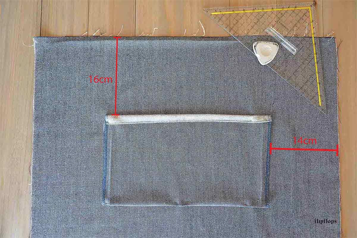 Cose el bolsillo pasando un pespunte por los 3 lados. Colócalo como ves en la imagen de forma que la parte de abajo este doblada a 1cm y los laterales no.