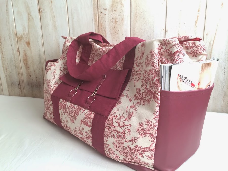 Usé dos tipos de loneta, estampada en toile para fuera y burdeos para dentro. En la parte de abajo y bolsillos laterales empleé polipiel, para reforzarla aún más.