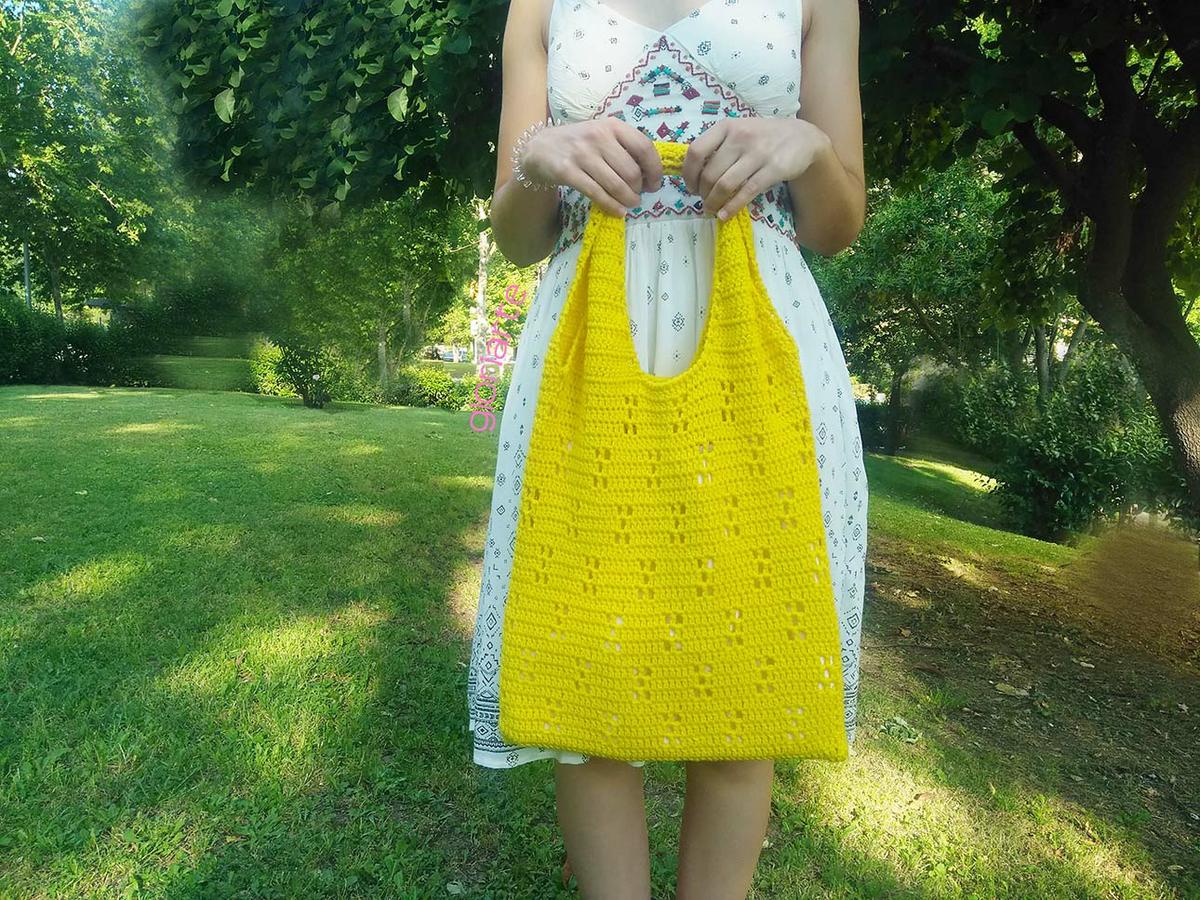 Este mes, he recibido 2 madejas preciosas, en color amarillo, con el que he querido tejer esta bolsa. Es súper sencilla y fácil de hacer, y queda preciosa gracias a estas madejas, que realmente tienen una gran calidad. Son artesanales, tintadas a mano, totalmente natural y eso se nota