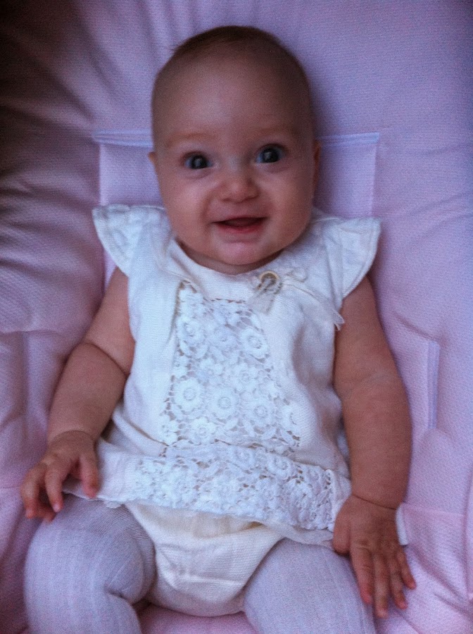 Y Vega, que contar de Vega.... Que tiene cuatro meses y medio y esta para meterle un bocadoooo. Ahora esta muy contenta porque la he pasado a la silla y va feliz cotilleando todo ( como buena mujer).