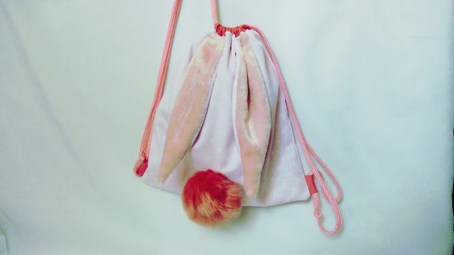 Es una mochila de tela con orejas de conejo con un tacto súper suave y un pompón. Mide unos 29 cm x 29 cm más o menos.