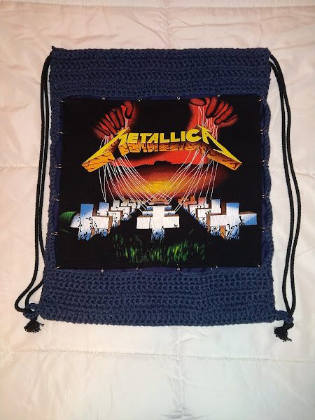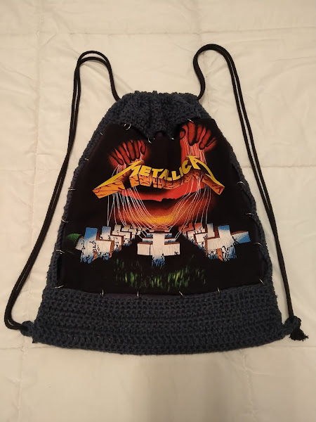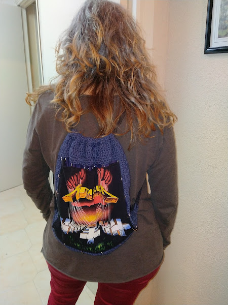 Pues bien, tenía yo una camiseta de tirantes de Metallica que llevaba la friolera de 14 años por lo menos sin ponerme jajaja ( el día que encuentre la foto que busco la pongo) y se me ocurrió hará un par de años hacerme una bolsa con ella, pero toda de tela y en la primavera pensé, porqué no hago una parte a ganchillo... y aquí está el resultado, el hilo es uno que han sacado de vaqueros reciclados que se llama Denim y que se teje fenomenal, le he puesto un forro ya que el parche sacado de la camiseta va enganchado con unas anillitas que compré en la mercería y bueno, pues dejo de daos la chapa y os pongo las fotiquis.