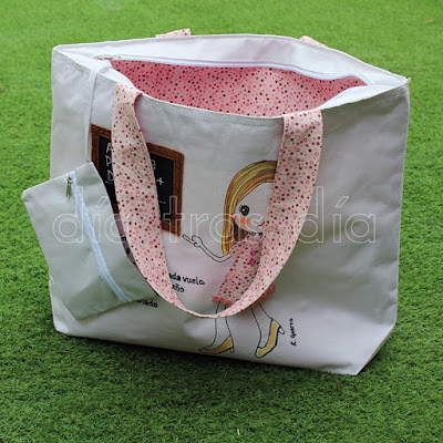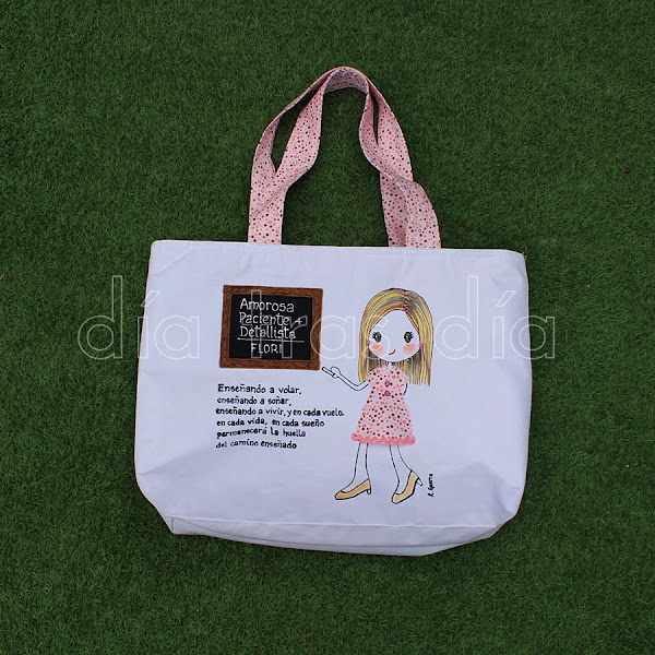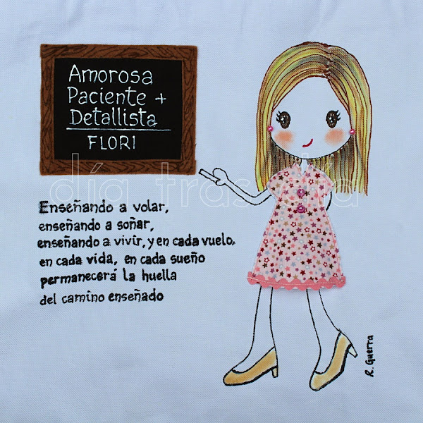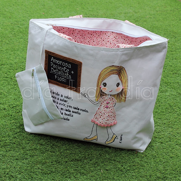 En esta ocasión Juana eligió una bolsa de playa del modelo de la maestra con su pizarra y como detalle para hacerla me indicó que a Flori le encantaba el color rosa. Me dijo que le gustaría que resultase muy cuqui. Por supuesto, me envió también fotos de la maestra para poder hacerla lo más personalizada posible.