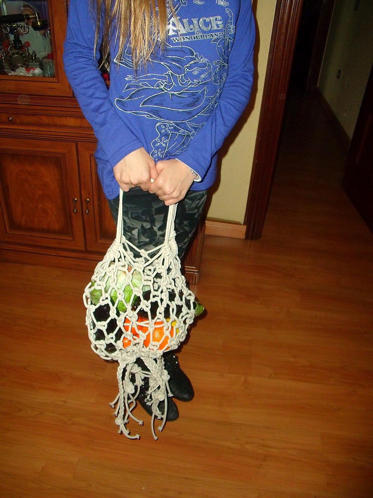 Aquí está la bolsa terminada, como os contaba en el vídeo para cerrar la bolsa sólo hay que seguir haciendo nudos y ella sóla se cierra. Como quedan hilos colgando, me ha parecido muy gracioso dejarlas colgando, las he trenzado y listo. Si no os gustan colgando, sólo teneis que pasar los hilos para dentro y cortarlos, tiene tantos nudos que no os preocupeis que no se va a abrir, ya vereis.