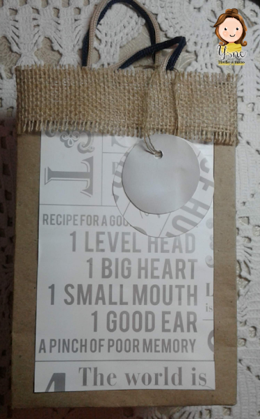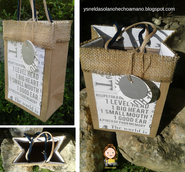 La realización fue muy sencilla: de una bolsa de regalo ya maltratada o usada corté dos rectangulos que taparan la publicidad de la bolsa. Pegué con silicona caliente.