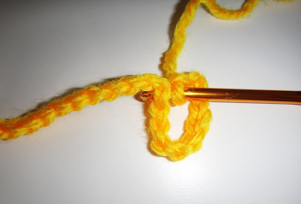 Vuelta 1: Pinchamos en el 12º punto contando desde el gancho formando un bucle de la cadeneta sobre si misma