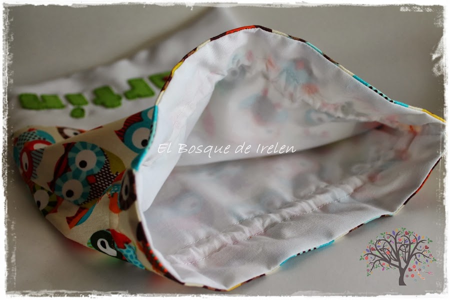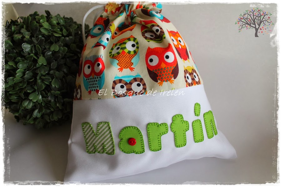 Hoy os enseño algo nuevo que he hecho, una bolsita de tela personalizada. Esta es para Martín, su mamá me la encargó para que lleve su desayuno al colegio. Está confeccionada con tela de algodón de búhos y piqué blanco con el nombre en tela y festoneada a mano. Por dentro va forradita con batista.
