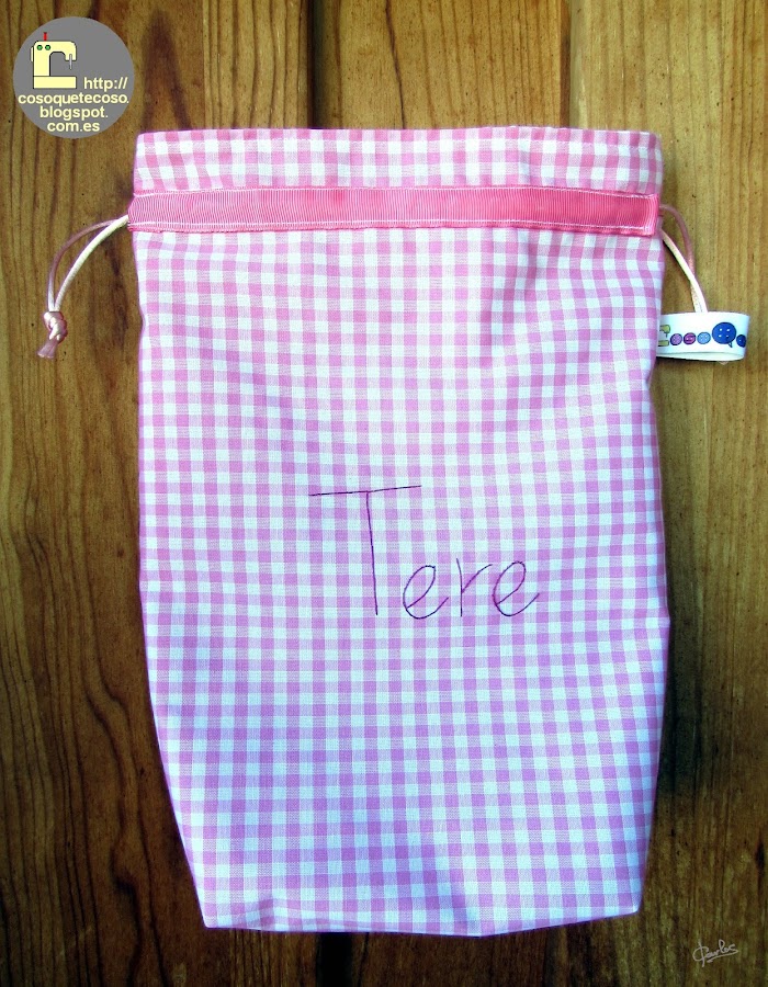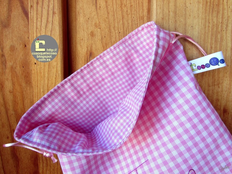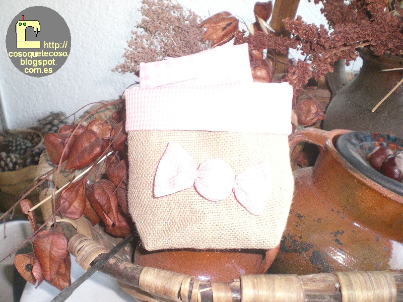 Os cuento que es de arpillera en color natural y de vichy rosa. Así me trabajáis un poquito la imaginación, que no es bueno dar todo hecho.