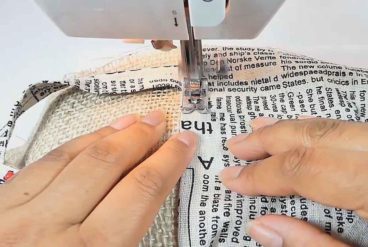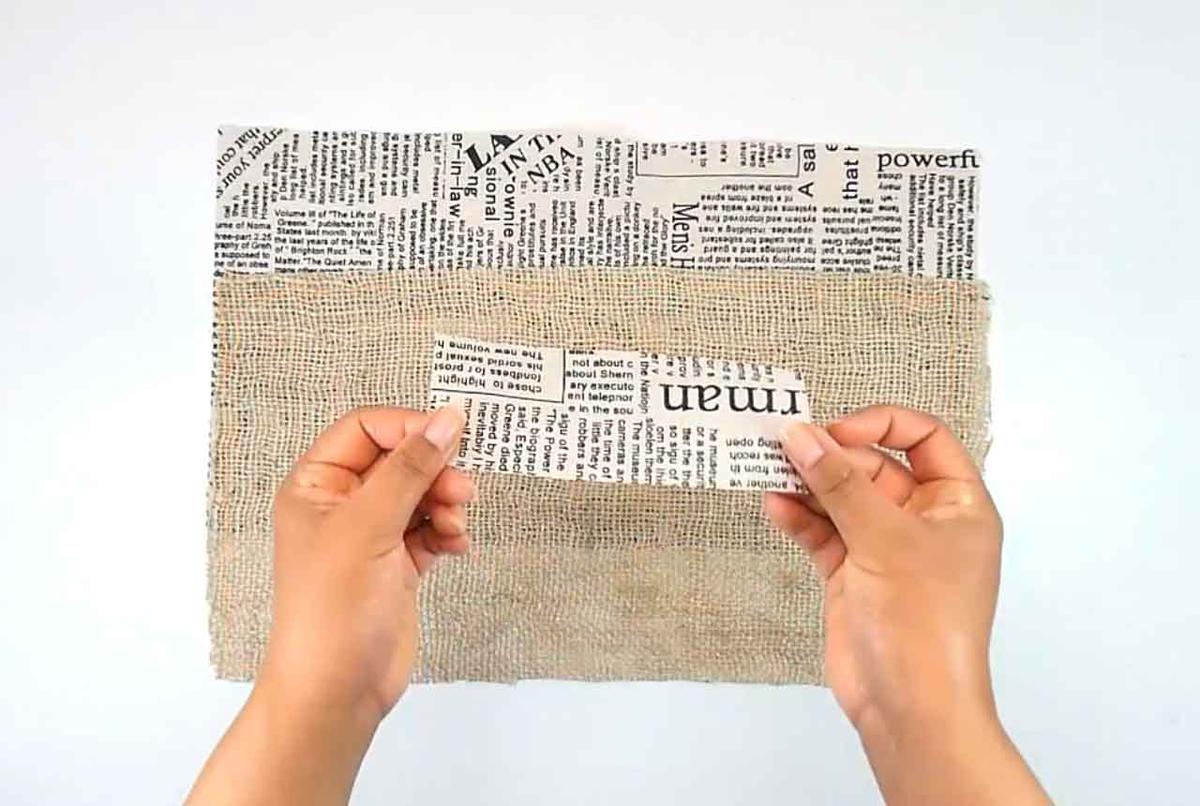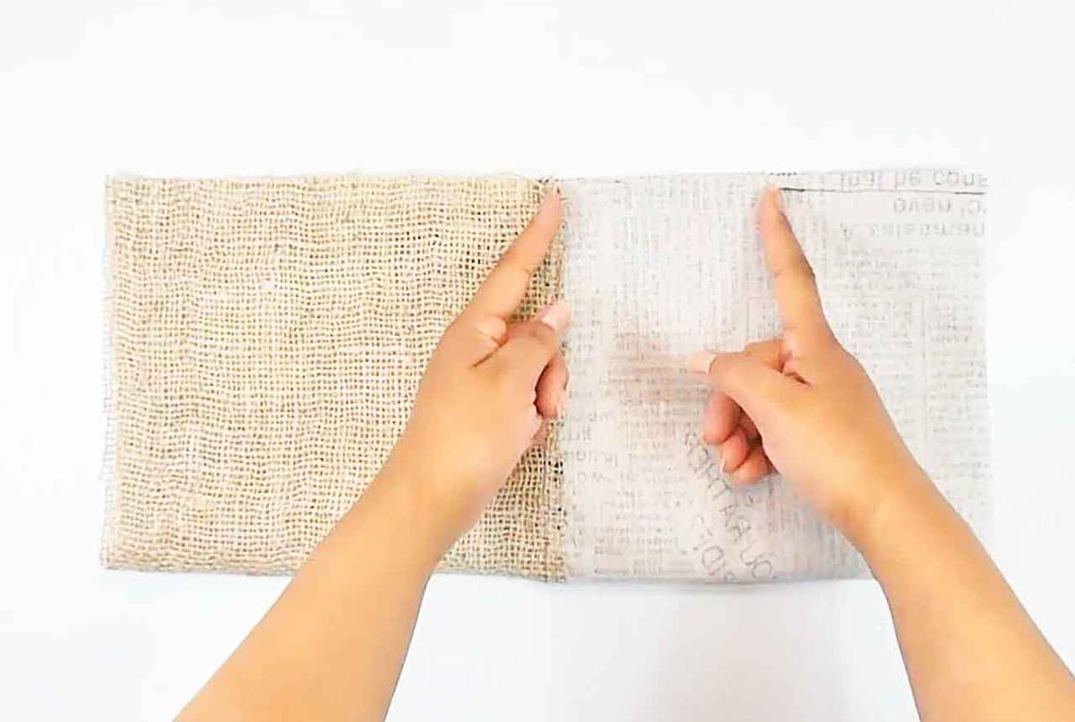 Cortar la tela de yute o arpillera y la tela del interior de 42 x 20 cm,
