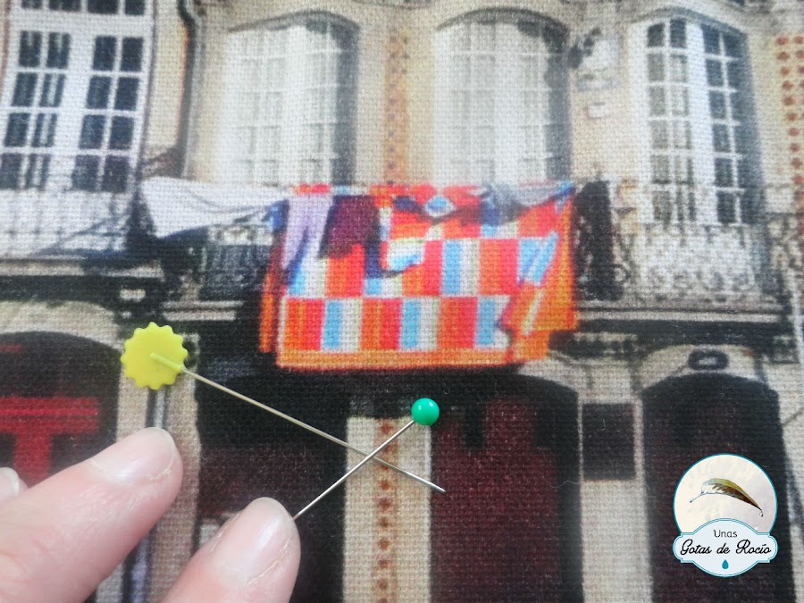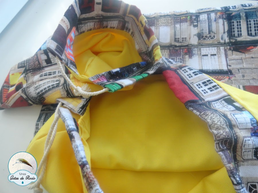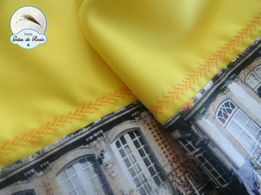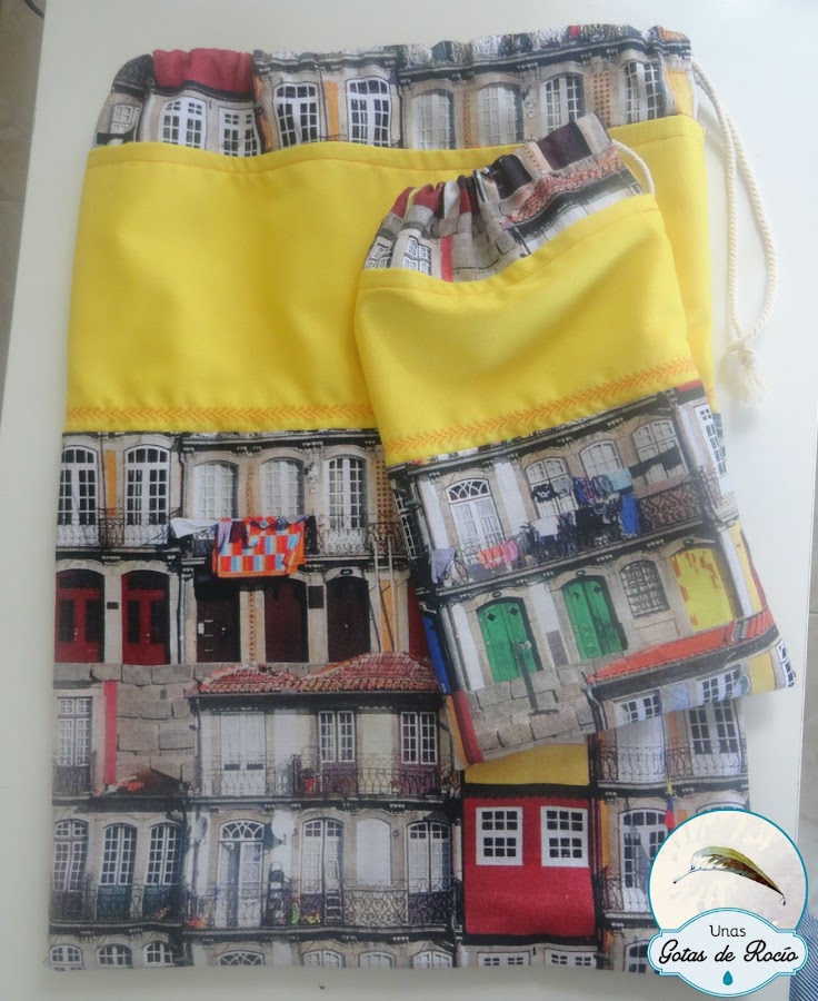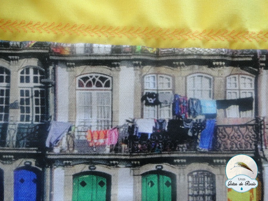 El otro día, sin pensar en el tema, mi mente recordó esa tela y le destinó una utilidad concreta. Así que enseguida me puse a coserla. Puesto que la tela reproduce balcones con ropa tendida, me pareció una idea estupenda hacerme una bolsa para la ropa sucia cuando viajamos. La combiné con una tela amarilla lisa a la que apliqué una puntada decorativa en naranja. Y con el trozo que me sobró hice una bolsita igual pero más pequeña para guardar los cargadores en esos días de viaje. Os di un avance en mi página de Facebook y de Instagram y ahora mismo os enseño el conjunto.