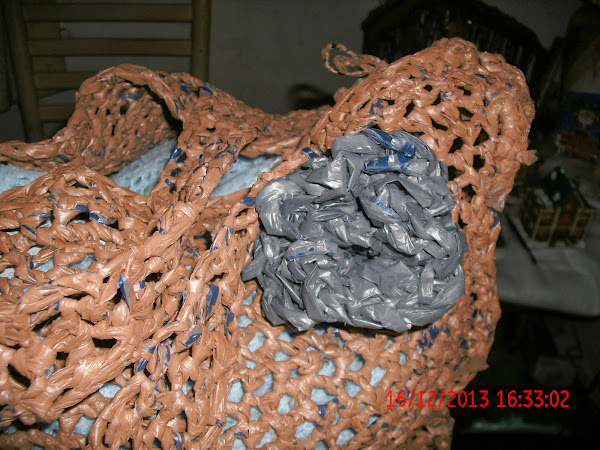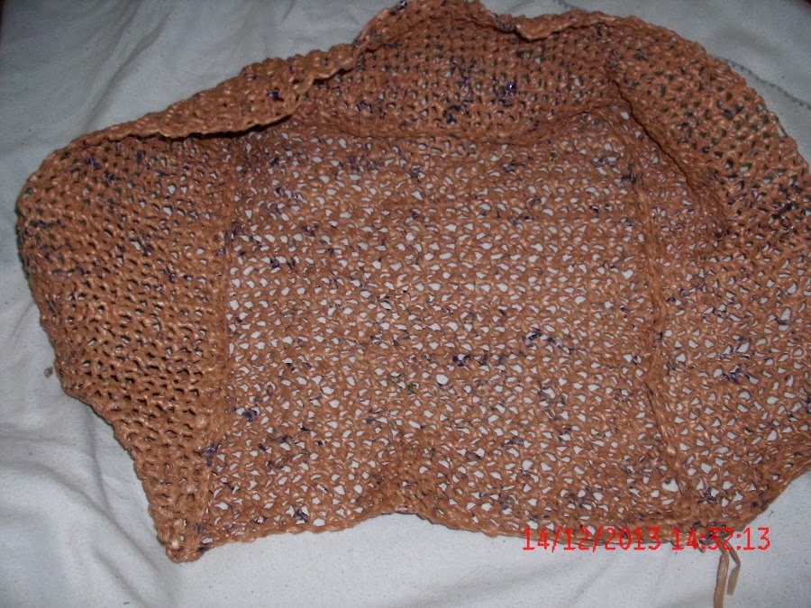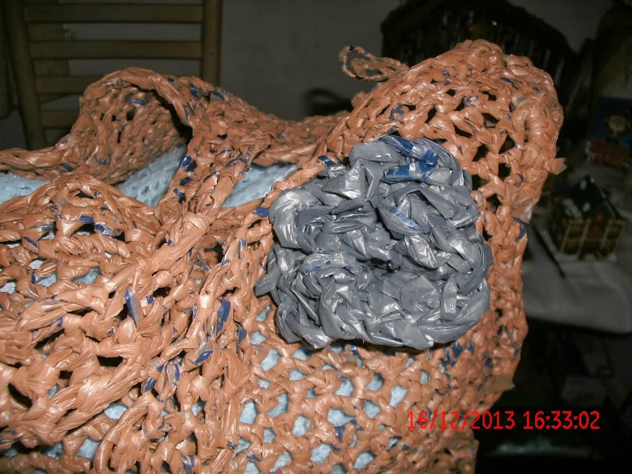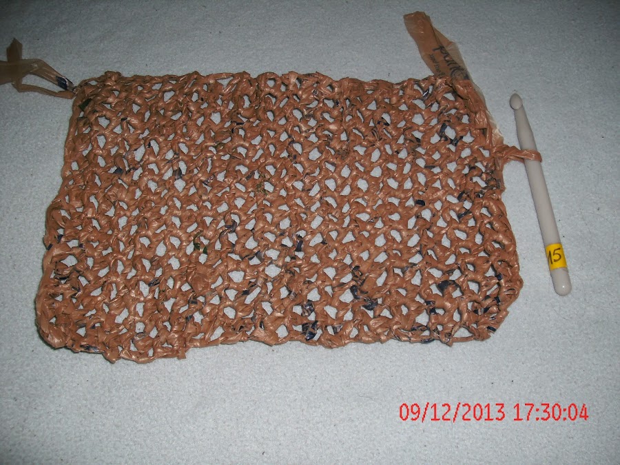 Ir haciendo el ovillo para que no se enrede, una ves hecho esto comenzamos a tejer, yo puse 30 cadenas utilizando una aguja de crochet numero 15, o sea gruesa, y lo tejí en medio punto o punto bajo, esto me dio un ancho de 40 cm,en realidad no la quería hacer tan grande.