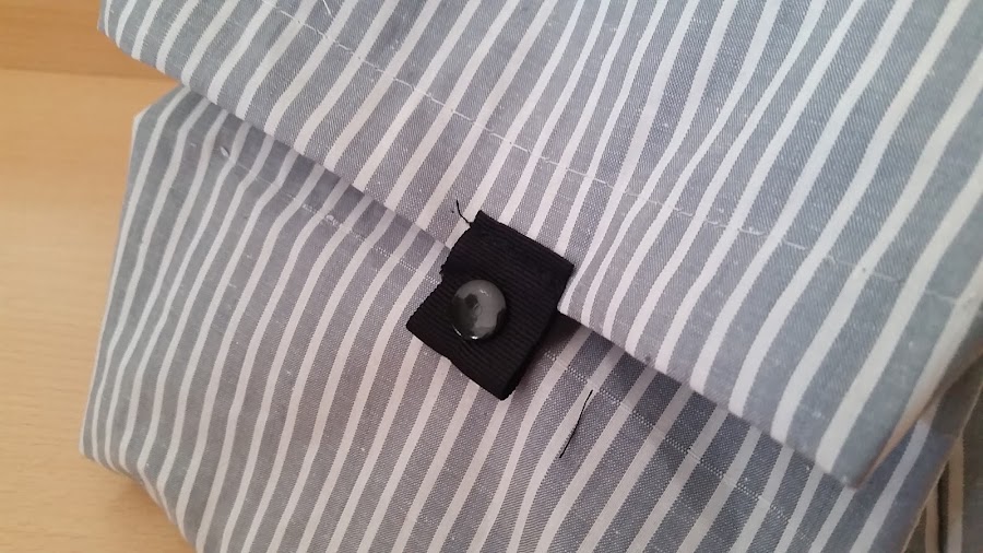 Una vez terminada la parte superior de la bolsa, en el centro ponemos una cinta de gros u otro material, junto a una broche a presión o velcro.