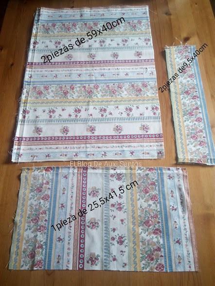 corta las piezas de tela con estas medidas, aparte de estas piezas de telas necesitamos otra 2 tiras de 10cmX 59cm