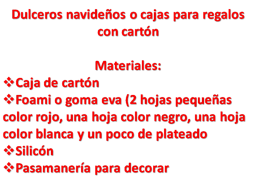 Para un dulcero de tamaño mediano necesitamos 1.5 hojas tamaño carta de foami o goma eva en color rojo, un cuarto de hoja de color blanco, solo una tira en color negro y un cuadro pequeño en color plateado...