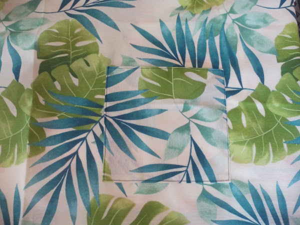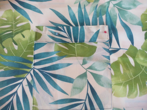 5. Para el bolsillo damos un pespunte con un pequeño dobladillo por todo alrededor en uno de los lados. Después marcamos con alfileres donde irá colocado y dejando un dobladillo cosemos en su sitio.