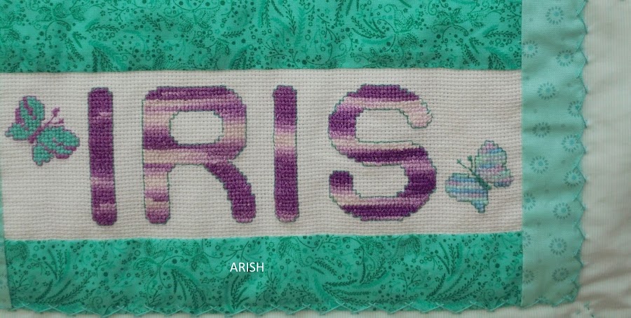 el nombre de la niña lo bordó mi hija a punto de cruz mientras estaba embarazada sin saber dónde lo íbamos a poner