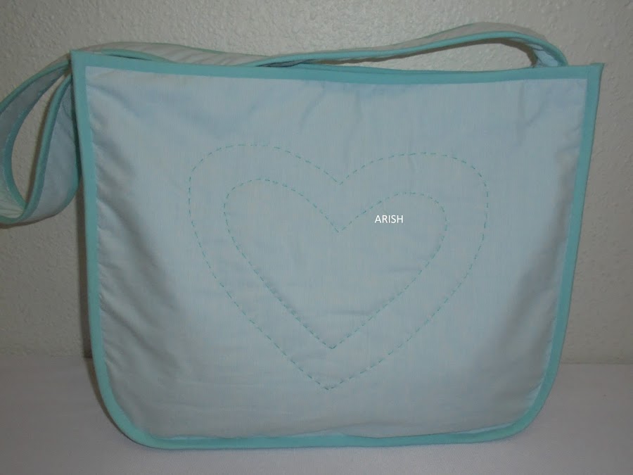 la bolsa está forrada en el interior con forro guateado y en el exterior, por la parte delantera, le he acolchado con hilo de perlé en verde mar unas mariposas, ya que es el dibujo que hay en su habitación