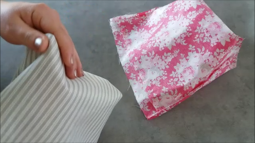 Entonces meteremos el forro (del derecho) dentro de la exterior (del revés), haciendo coincidir las costuras laterales.