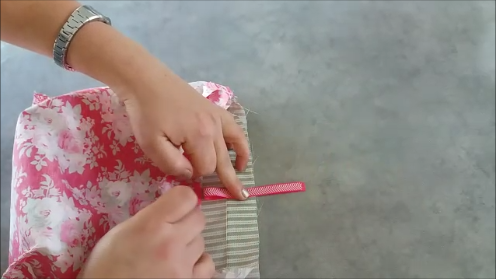 Metemos entre ambas telas la cinta que hará la función de ojal...