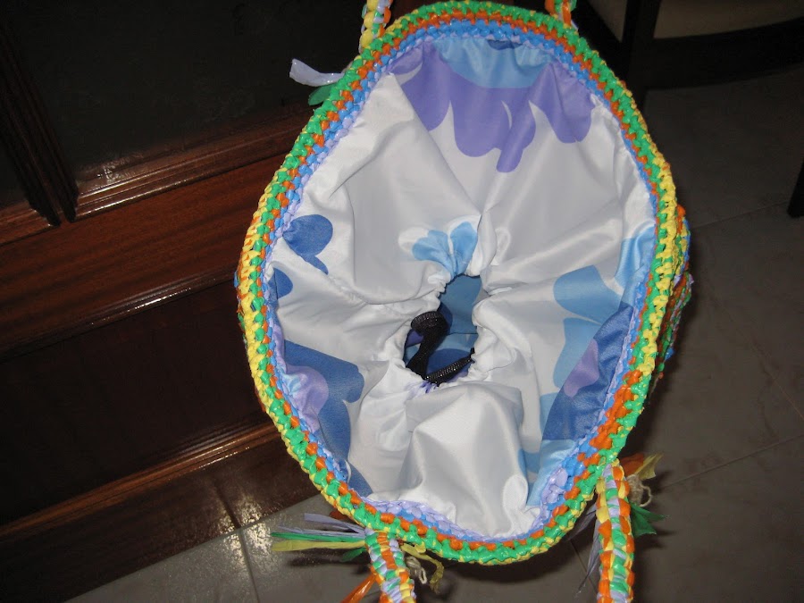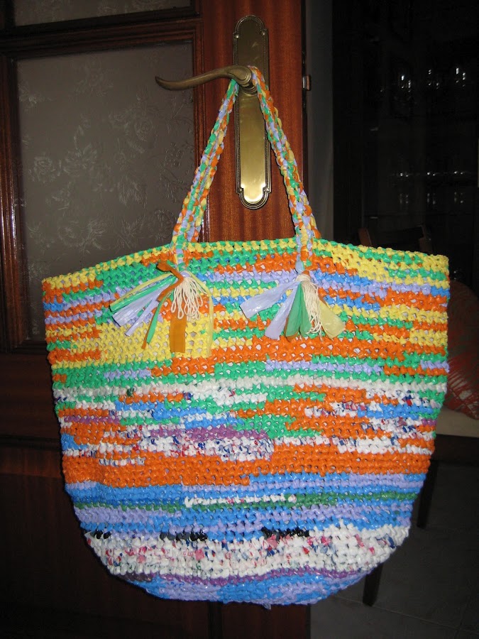 Esta bolsa la he hecho a ganchillo reciclando bolsas de plástico