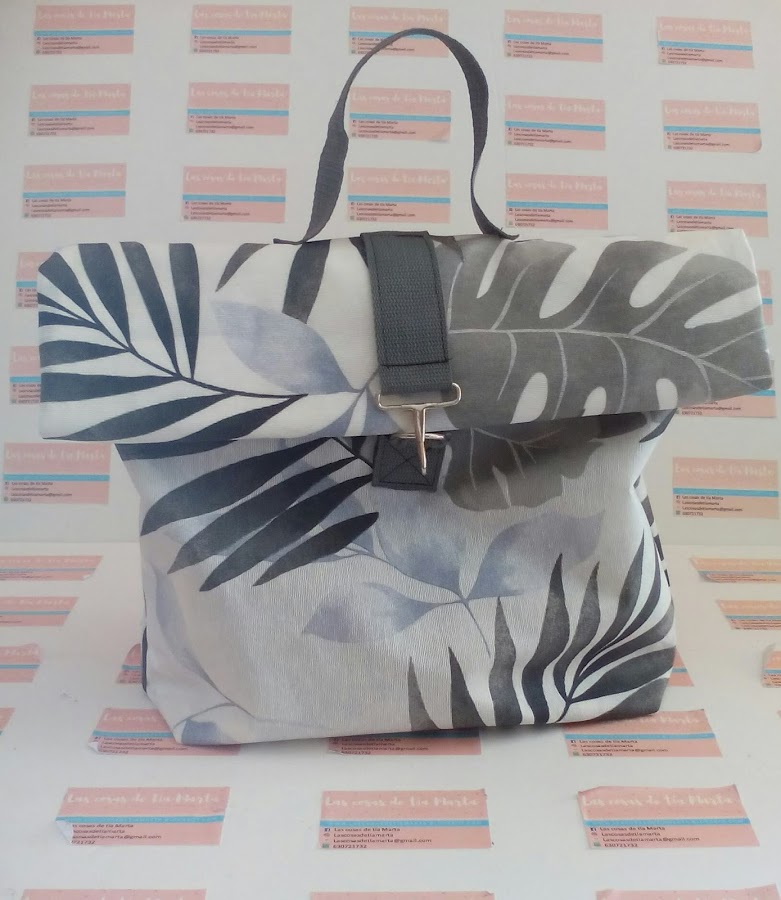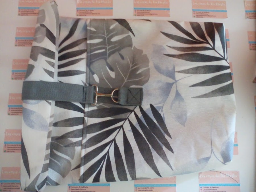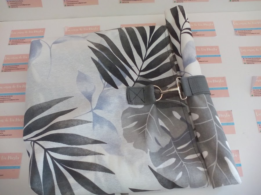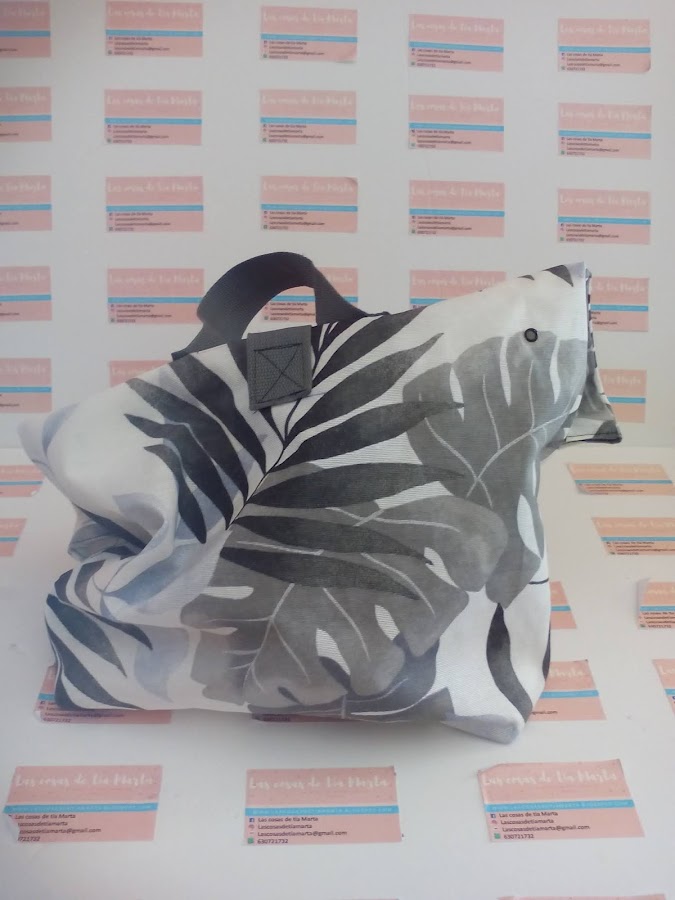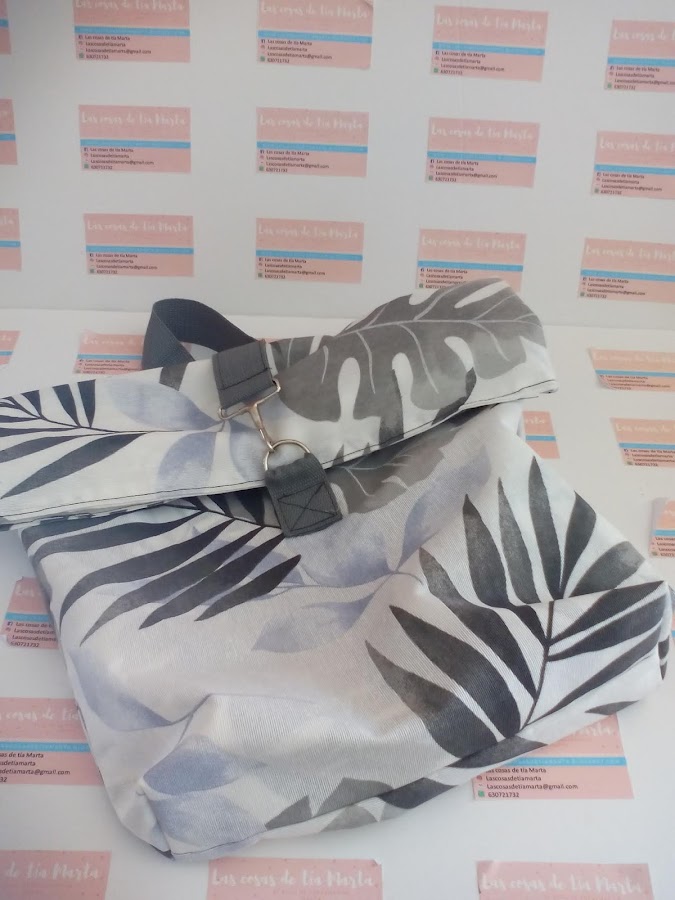 Consta de un bolsillo en el frente, se cierra con un mosquetón y llegando la tela. Tiene un asa corta y por dentro tiene varios compartimentos además de un orificio para poder sacar el hilo.