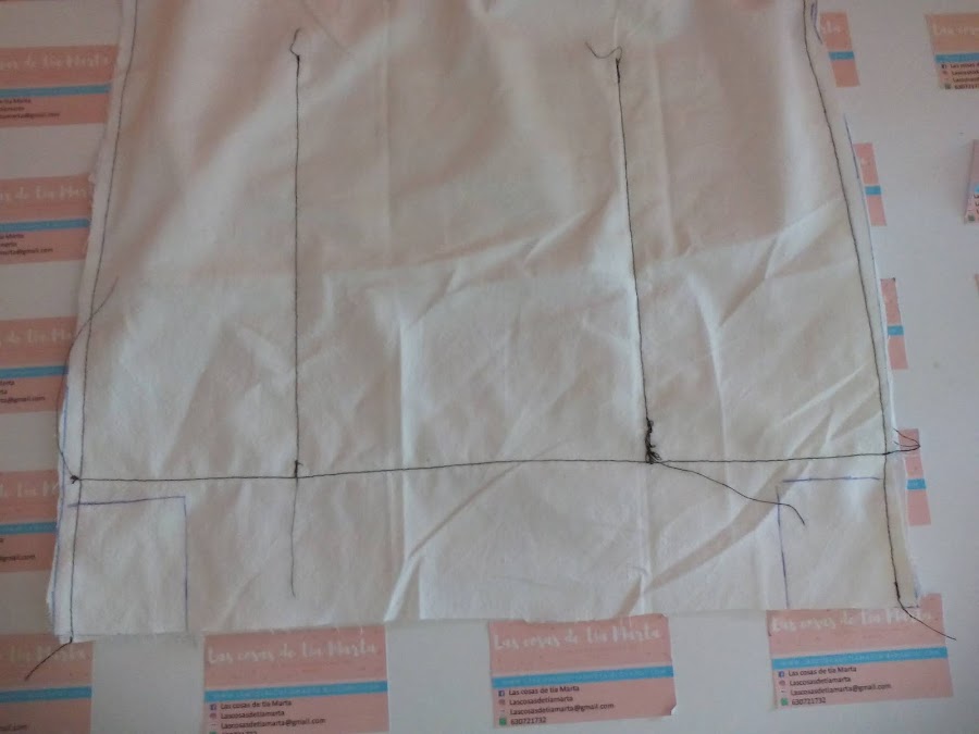 5. Vamos a hacer el fondo de la bolsa. Para ello marcamos un cuadrado de 5*5 cm y cosemos por los laterales hasta cerrar la bolsa.