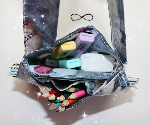 Como os he comentado más arriba, esta bolsa plastificada es que el peque meta unas cuantas cosas y vaya entretenido, con eso que quiero decir, que se compone de 3 compartimentos o bolsillos más uno lateral que se accede desde ambos lados, donde iria la libreta, y en los superiores pondríamos colores, rotuladores, etc.