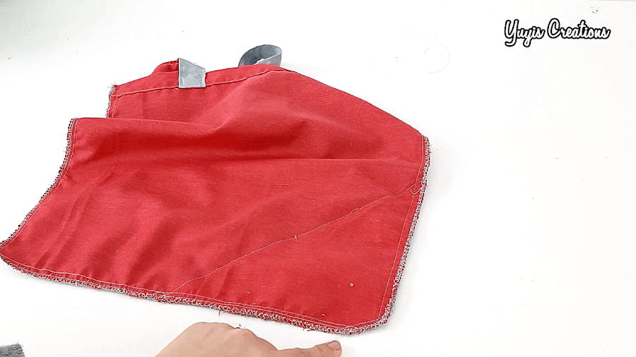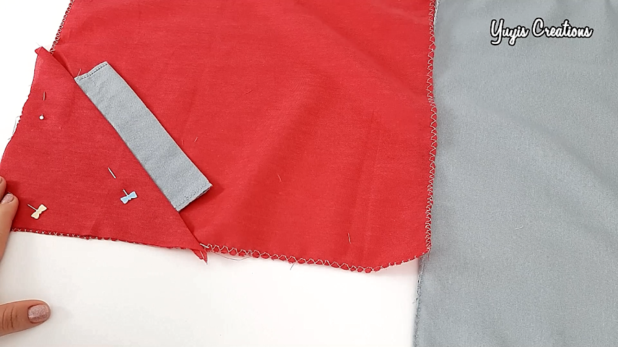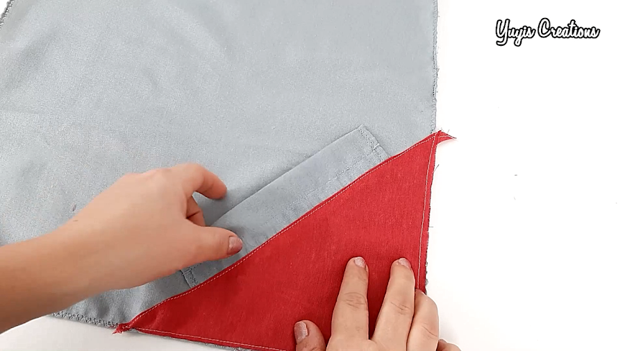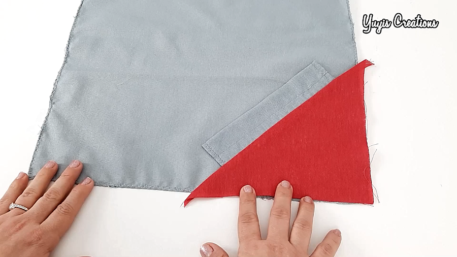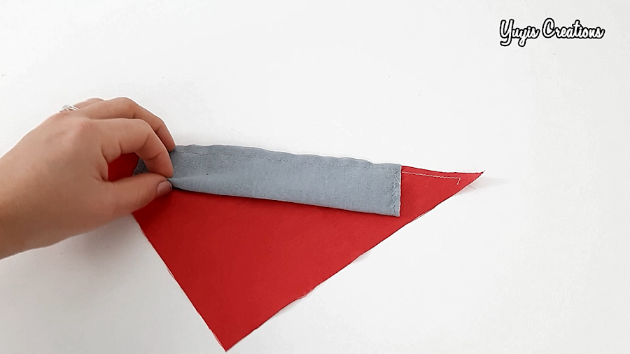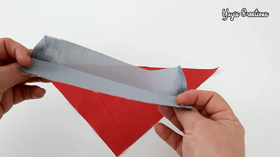 De esta forma cuando unamos ambas piezas derecho con derecho, ambas piezas triangulares coincidirán. Esto lo cosemos por el lateral, por debajo y en diagonal, el resultado es este:
