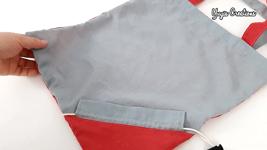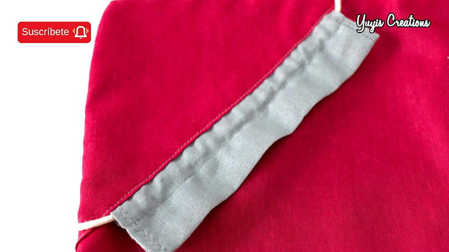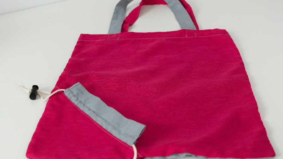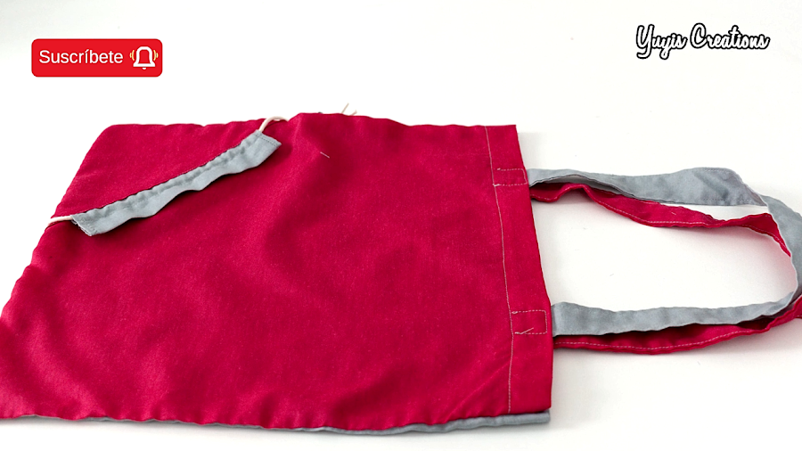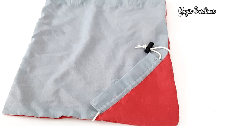 Damos la vuelta a la bolsa y colocamos el cordón y el tope y anudamos el extremo del cordón.