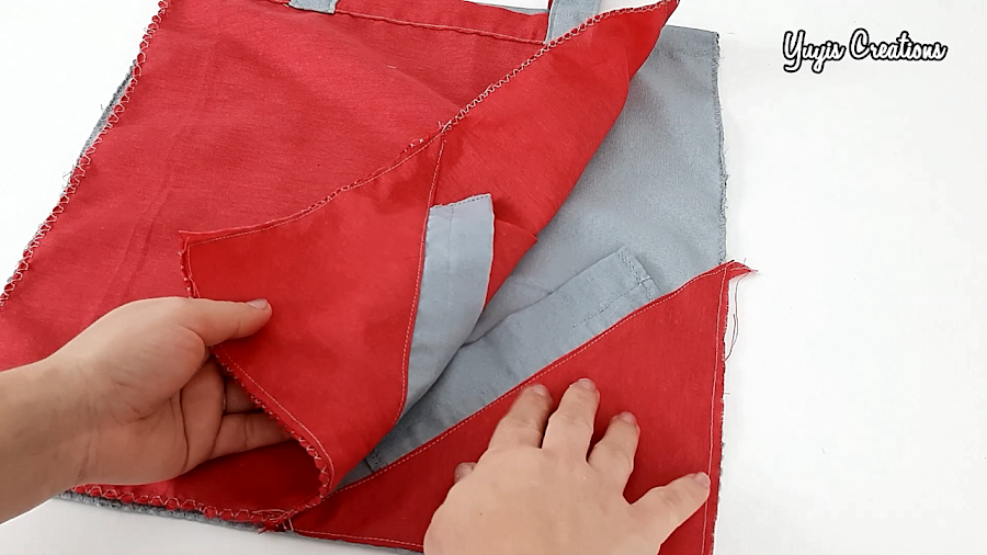 Hacemos esto con ambas telas triangulares, luego colocaremos esto en nuestras piezas principales: una en el lado inferior derecho y la otra en la otra pieza del bolso en el lado inferior izquierdo, de esta manera: