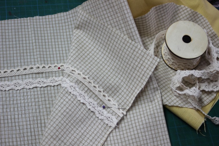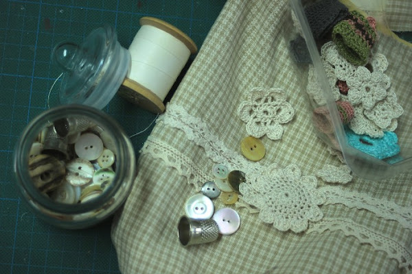Las bolsas de tela quedan preciosas si llevan un fondo de otro color, y además me gusta que tengan algún detallito, así que mi bolsa llevará encajes y botones...