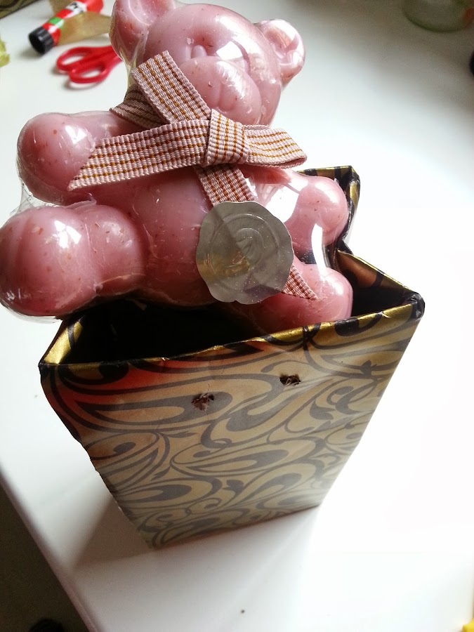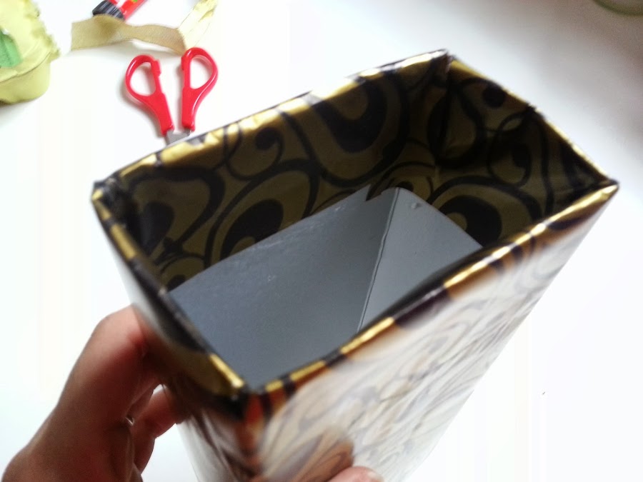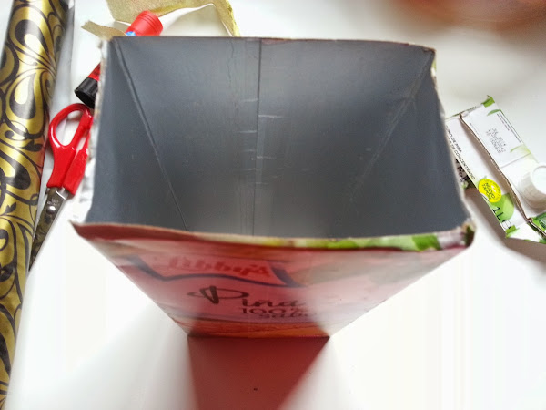 4) Forramos el tetrabrik pegando el papel y dejando en la parte superior un trozo más grande, que doblaremos y pegaremos hacia adentro.