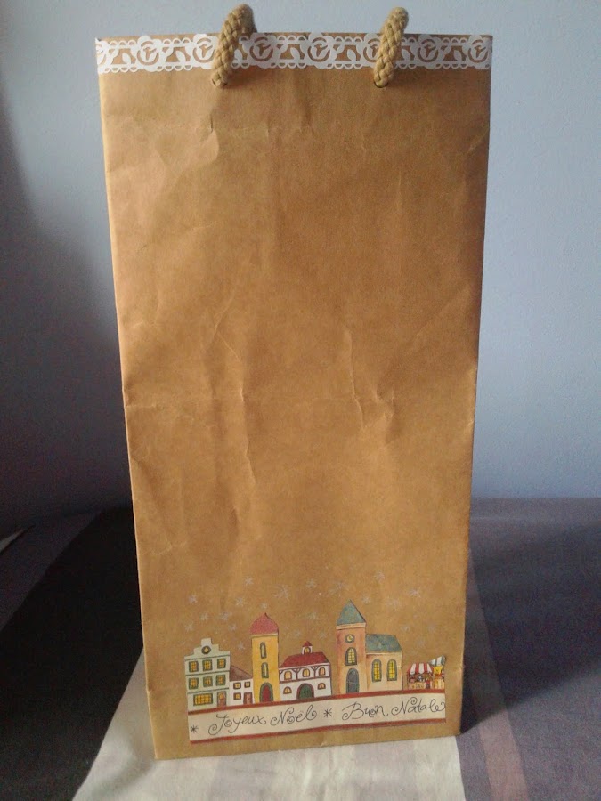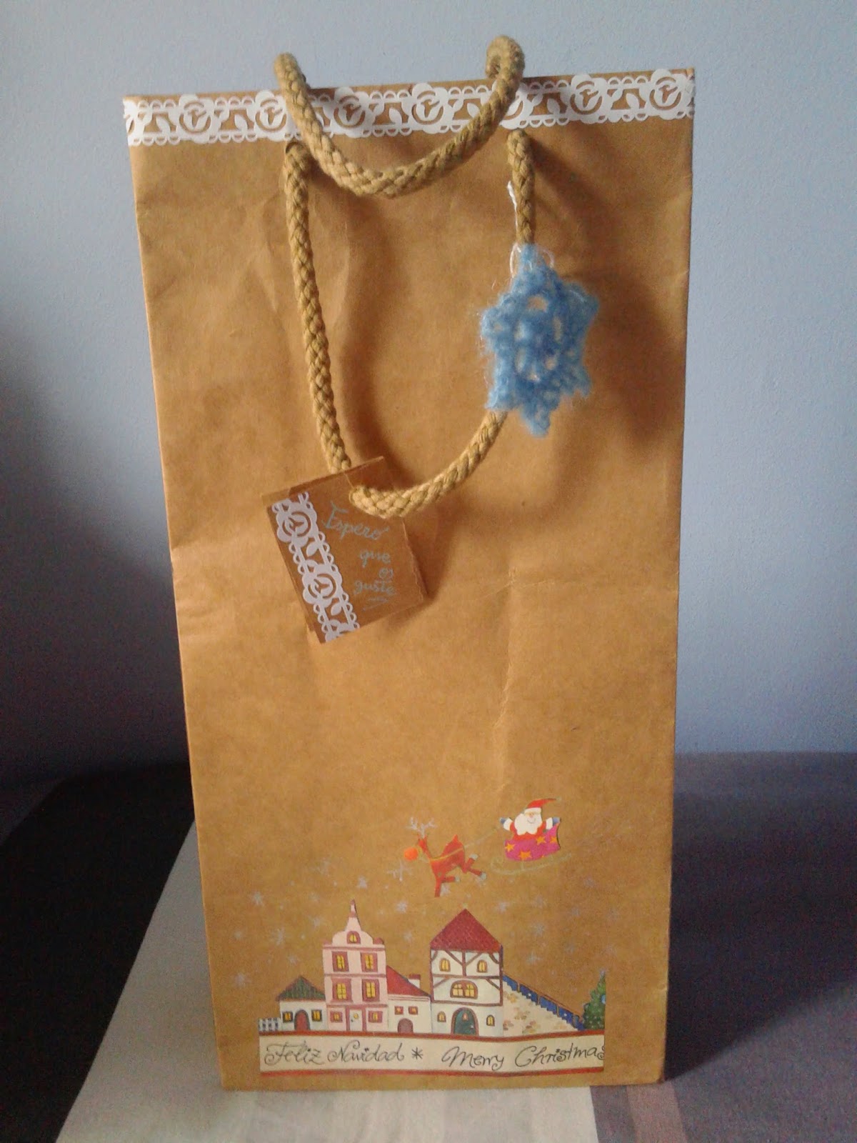 Tenia una bolsa de papel, recorte las casitas de otro papel de regalo y las pegue.La estrella es echa a ganchillo