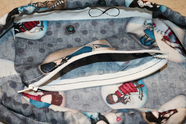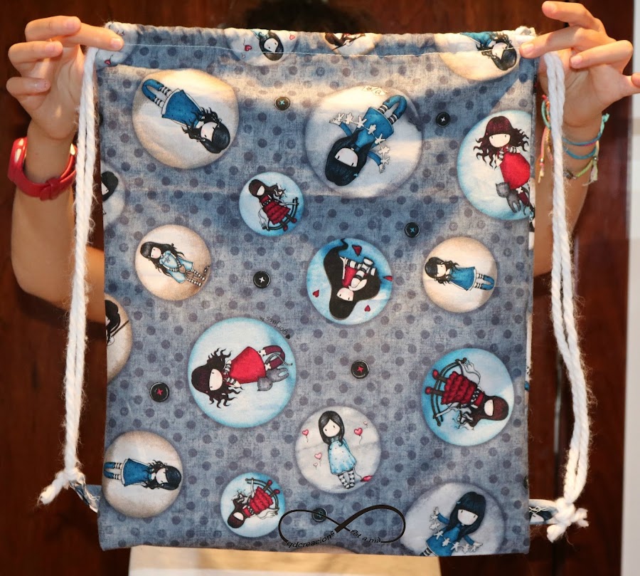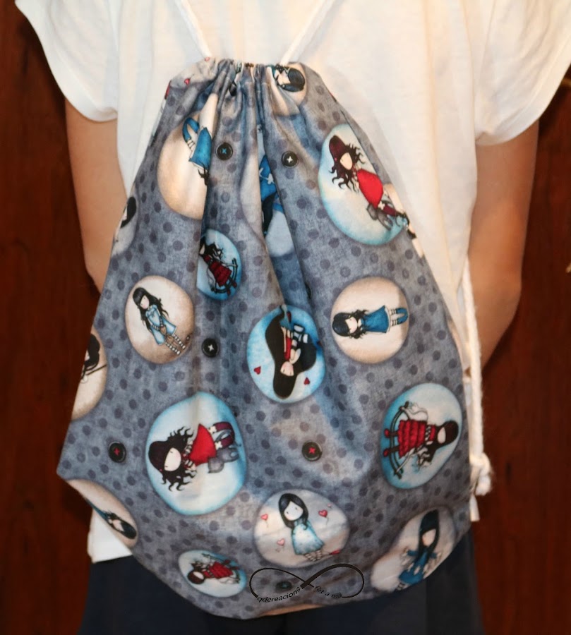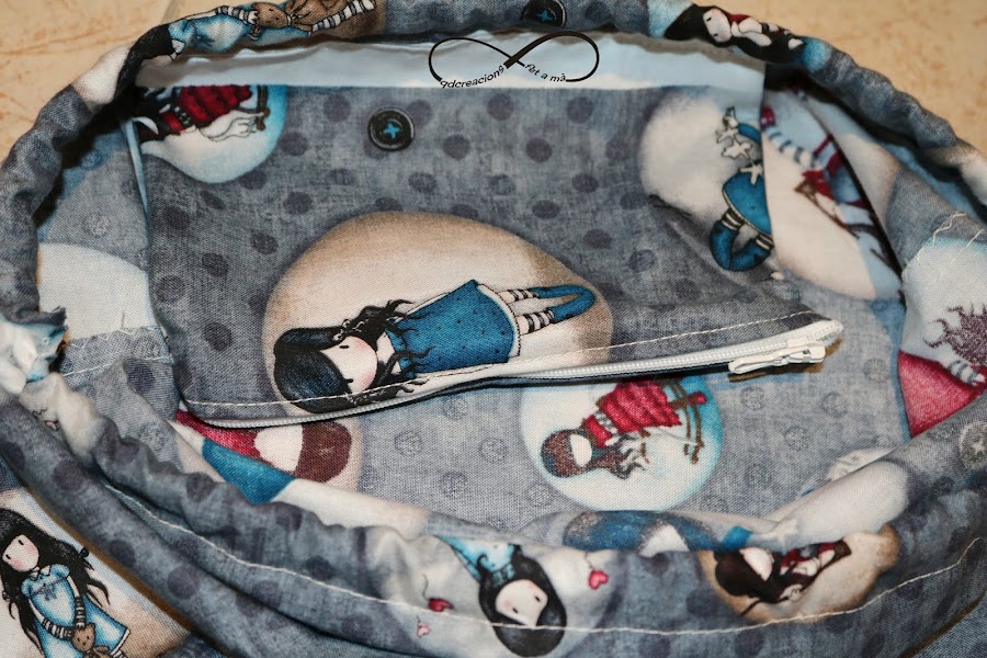 No me enrollo más y os enseño unas fotos de esta bolsa saco en tela con motivos de las gorjuss, en su interior he añadido un bolsillo que lo cosí con la apertura para abajo para darle caída. Es muy cómodo ponerse la bolsa en las piernas o apoyada en cualquier superfície y abrirlo. Me parece muy original.