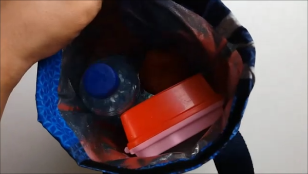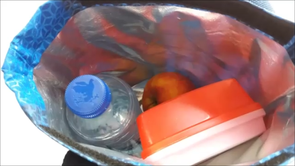Como podrás ver, en esta bolsa además de un envase para la comida, también cabe una botellita de agua, una pieza de fruta y aún hay espacio para algo más.