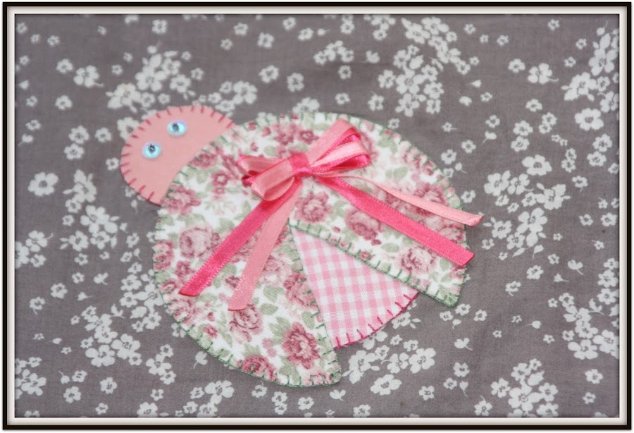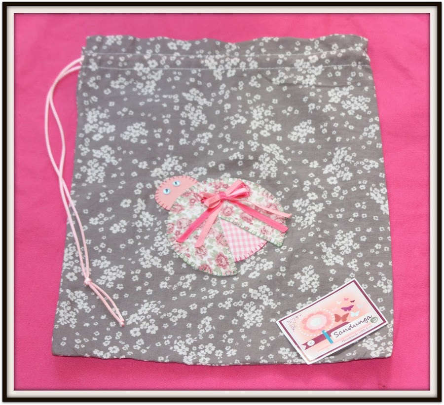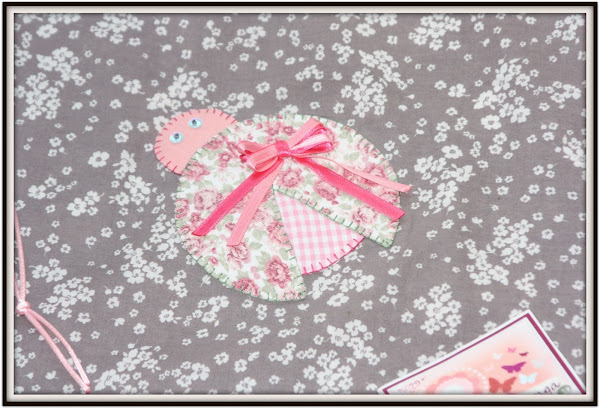Utilicé una tela gris con flores blancas para la bolsa y encima le puse una mariquita con telas en tonos rosas y un lacito para adornar de los mismos tonos.