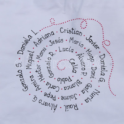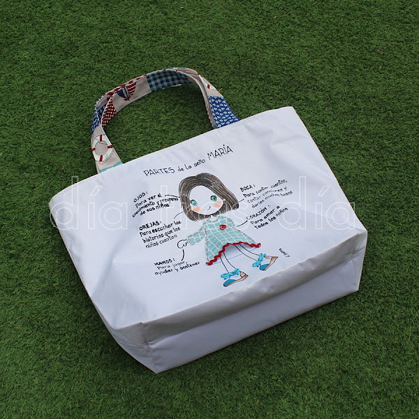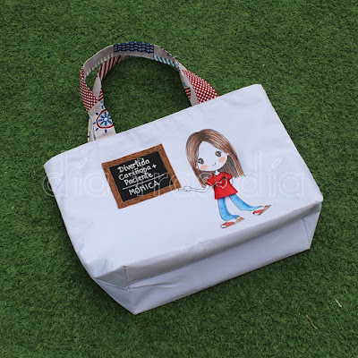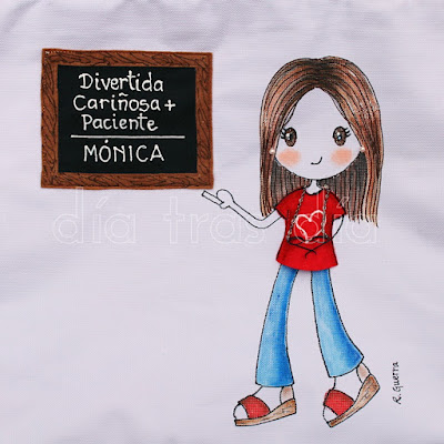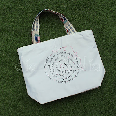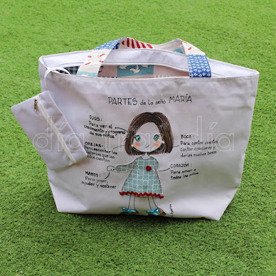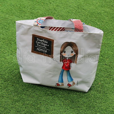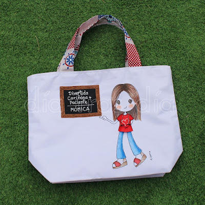 La segunda bolsa fue para la seño María. Para ella ya había realizado yo hace algunos años esta camiseta y esta muñecaamigurumi personalizada. Así que este año ya ha sumado también la bolsa de playa a su lista de regalos personalizados Día tras Día, jeje.