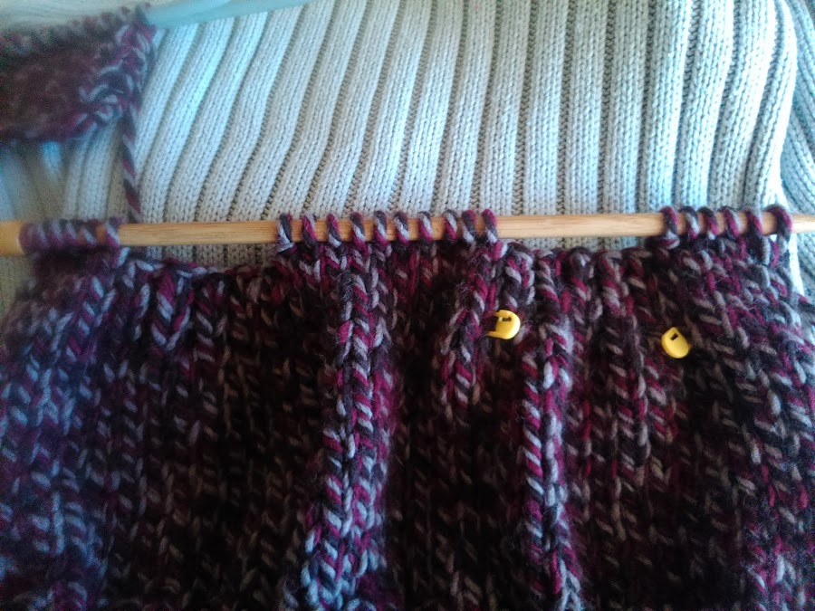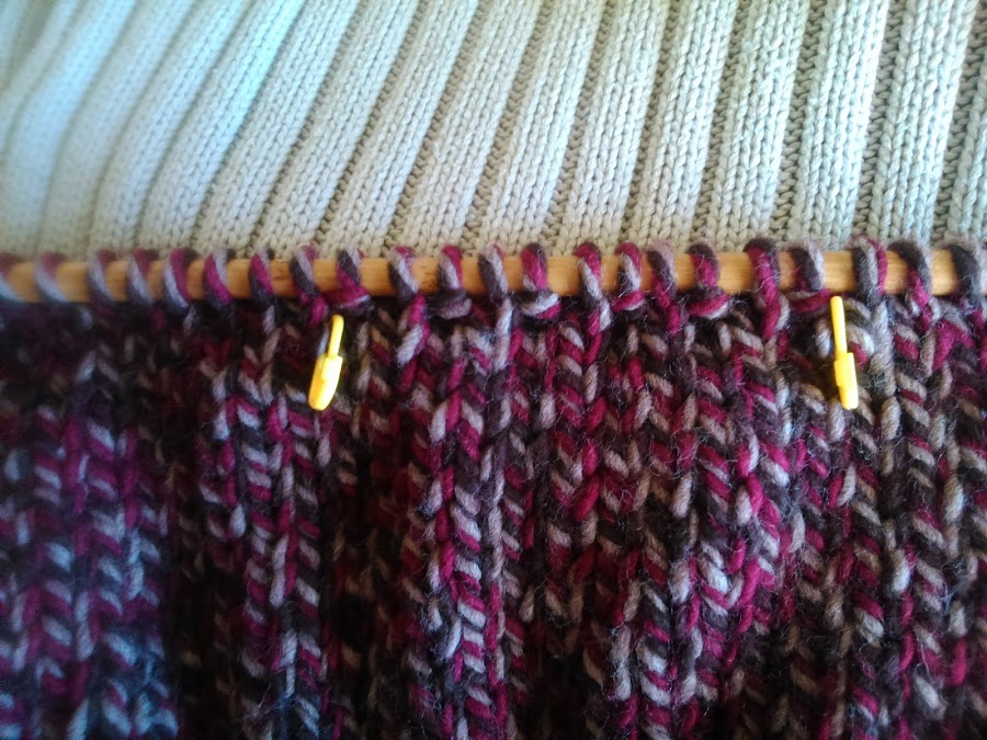 en primer lugar marcamos con los anillitos (marcadores ) el lugar dónde van los bolsillos,en mi caso son 11 puntos,siempre nº impar porqué asi empezamos y acabamos siempre con el mismo punto,estos puntos los trabajamos a punto elástico (uno derecho y uno revés...)....