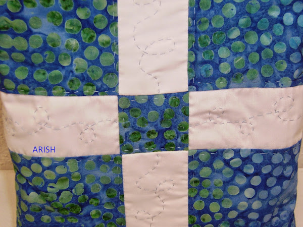 la forma de los cuadrados no ha sido al azar, los tenía cortados para la colcha de mariposas que le hice y al final no me encajaban y no los utilicé, para unirlos y para el interior he empleado un resto de algodón blanco y le he pasado unos puntos con hilo encerado azul