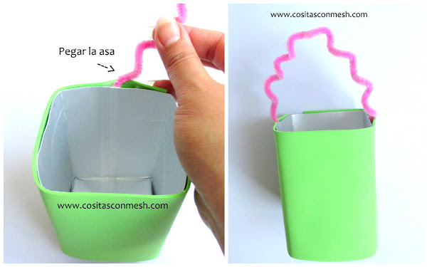 4.- Con silicón líquido pego el asa (limpiapipa ) dentro de la caja de leche. Listo ya tenemos la bolsita de dulces, ahora hagamos a nuestto pingüino navideño.