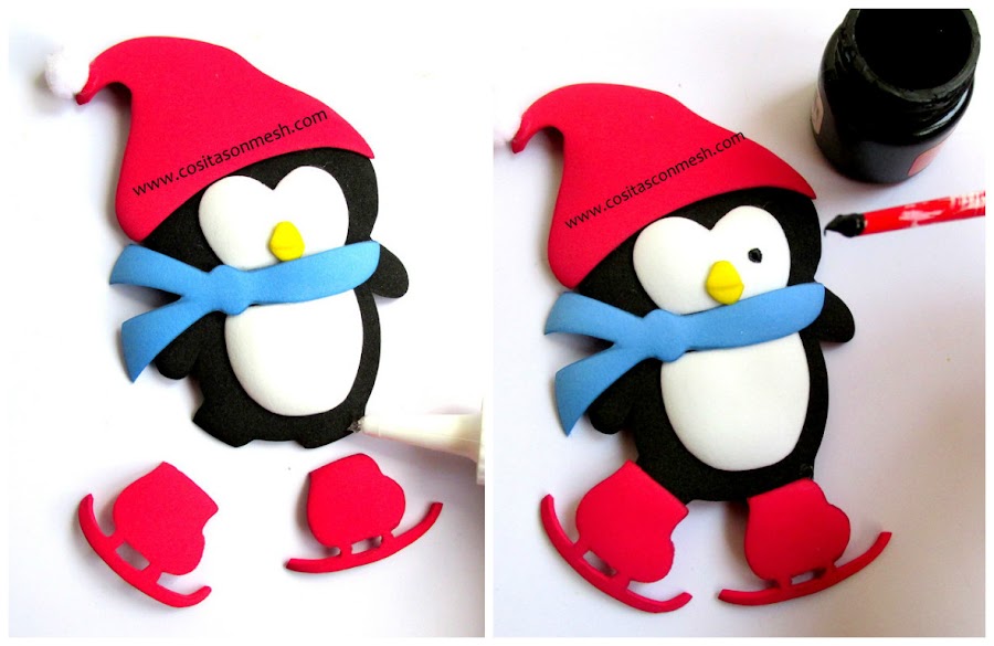 5.-Ahora pegamos las patinetas del pingüino navideño.
