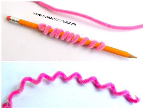 3.- Con limpiapipa ( chenille) color rosa, lo enrollare sobre el lápiz, luego sacare el limpiapipas y se vera rizado.