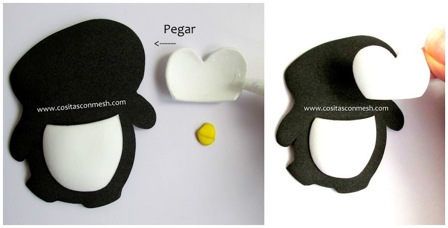 2.- Con silicón líquido pondré pegamento solo en el borde de cada molde de foami blanco, luego lo pegare sobre el cuerpo del pingüino, no aplastes el foami solo presiona en todo el borde donde se puso pegamento.