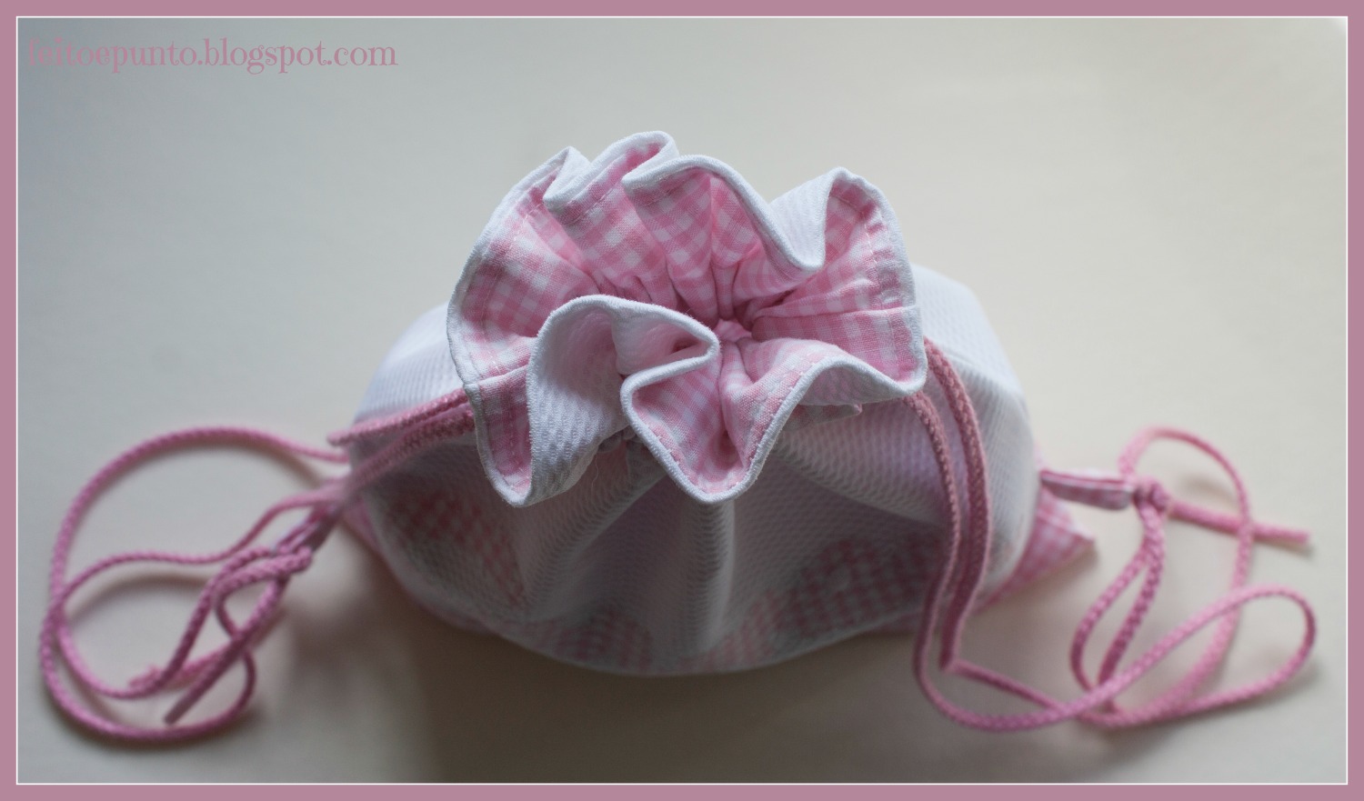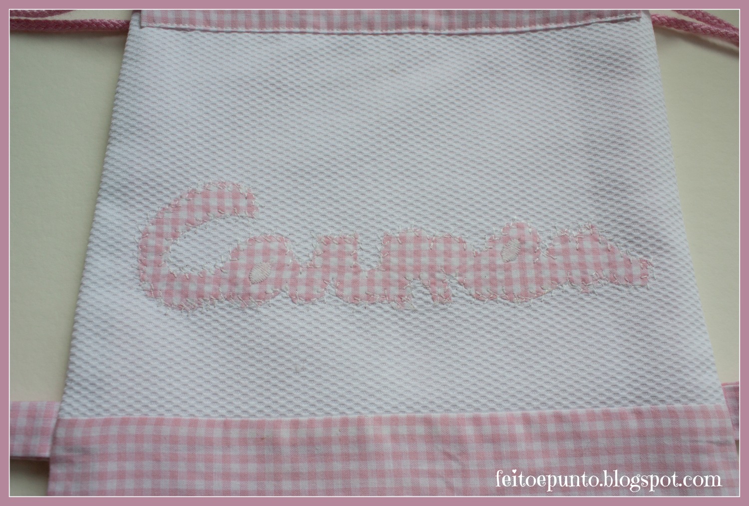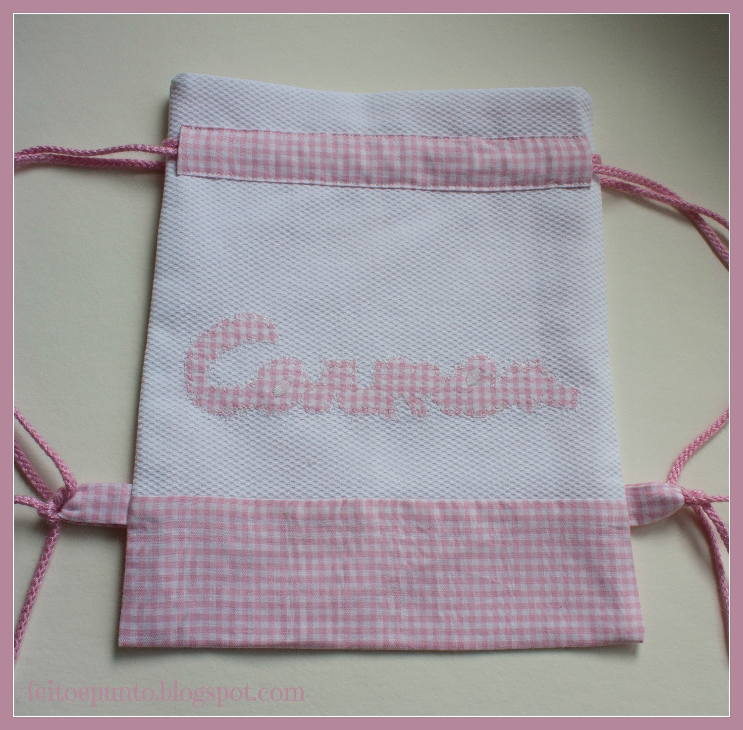 La bolsita es de piqué blanco adornada con los cuadritos vichy. Va forrada con los mismos cuadritos. Quería hacerle un bolsillo interior, lo tenía cortado y todo pero con las prisas se me olvidó... mecachis!!