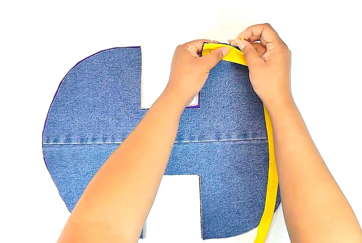 Abrir los dobleces de la cinta al bies y colocar en los bordes semicirculares con la ayuda de alfileres.