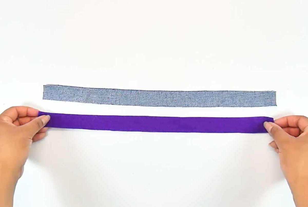 Cortar tiras de 40 x 3 cm, una en jeans y otra en fieltro, si quieres poner más asas deberás cortar un par por cada asa.